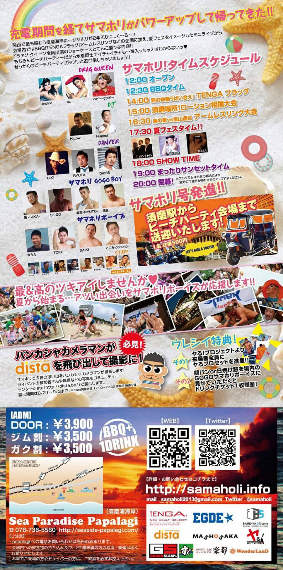 7/24(日)、関西発!真夏のゲイビーチパーティー『サマホリ』が須磨浦海岸のPAPALAGIという海の家で開催されます。